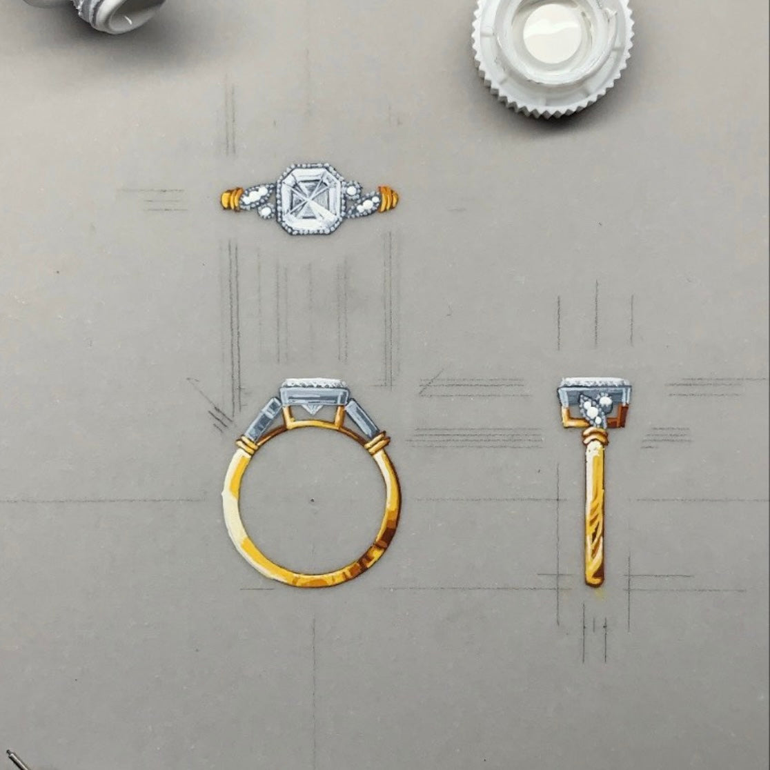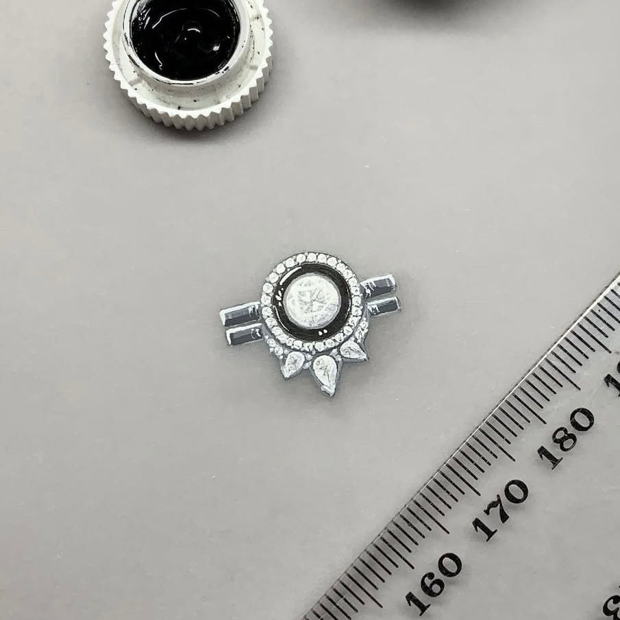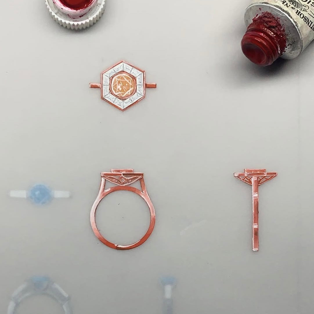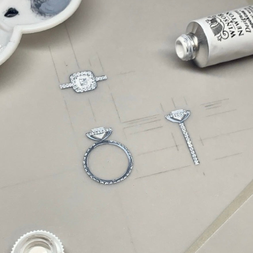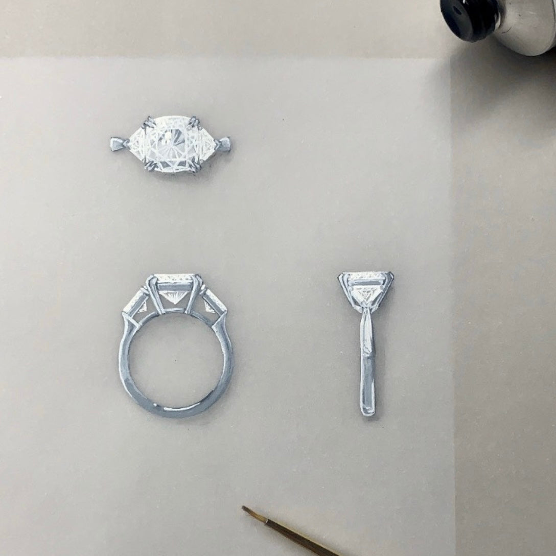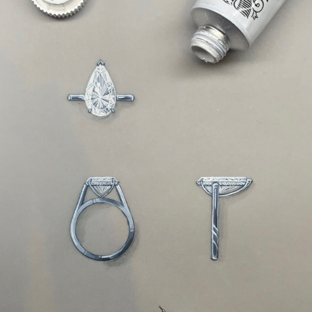 After an initial discussion with a client, Harrison will draw up a variety of sketches to help the client visualise what the final piece might look like. Once the design is finalised, should you wish, Harrison offers a life sized, hand painted render of your piece as an extra alongside your jewellery.