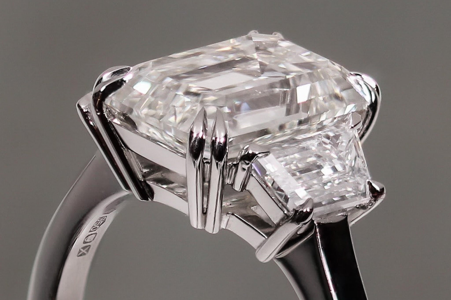 This bespoke engagement ring showcases a 3.5ct emerald-cut diamond, set in a platinum band and flanked by two matching trapezoid diamonds. The stunning design is enhanced with double talon claws for the center diamond and single talon claws for the side stones, creating a timeless and elegant diamond engagement ring.